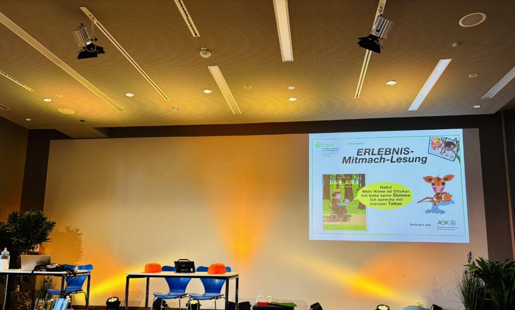 Damit die Kinder die Erfahrung ganz unmittelbar erleben konnten, durfte eine Schülerin aus der zweiten Klasse den Talker bedienen. Mit Begeisterung übernahm sie Ottokars Rolle und ließ die Figur zum Leben erwachen. So wurde die Lesung interaktiv und greifbar.