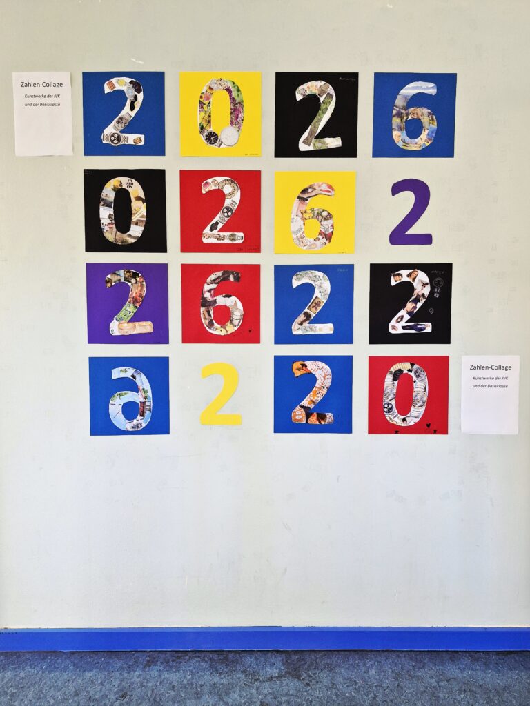 Die Kinder der IVK und der Basisklasse präsentieren zum neuen Jahr eine neue Ausstellung mit kreativen Zahlen-Collagen. Entstanden ist ein buntes 2026! Mit viel Fantasie und Kreativität gestalteten die Schülerinnen und Schüler einzigartige Collagen mit den Zahlen 0, 2 und 6 in unterschiedlichen Anordnungen, in denen das neue Jahr immer wieder neu entdeckt werden kann. Die farbenfrohen Zahlenmuster und Formen schmücken nun den Flur im Haus A.